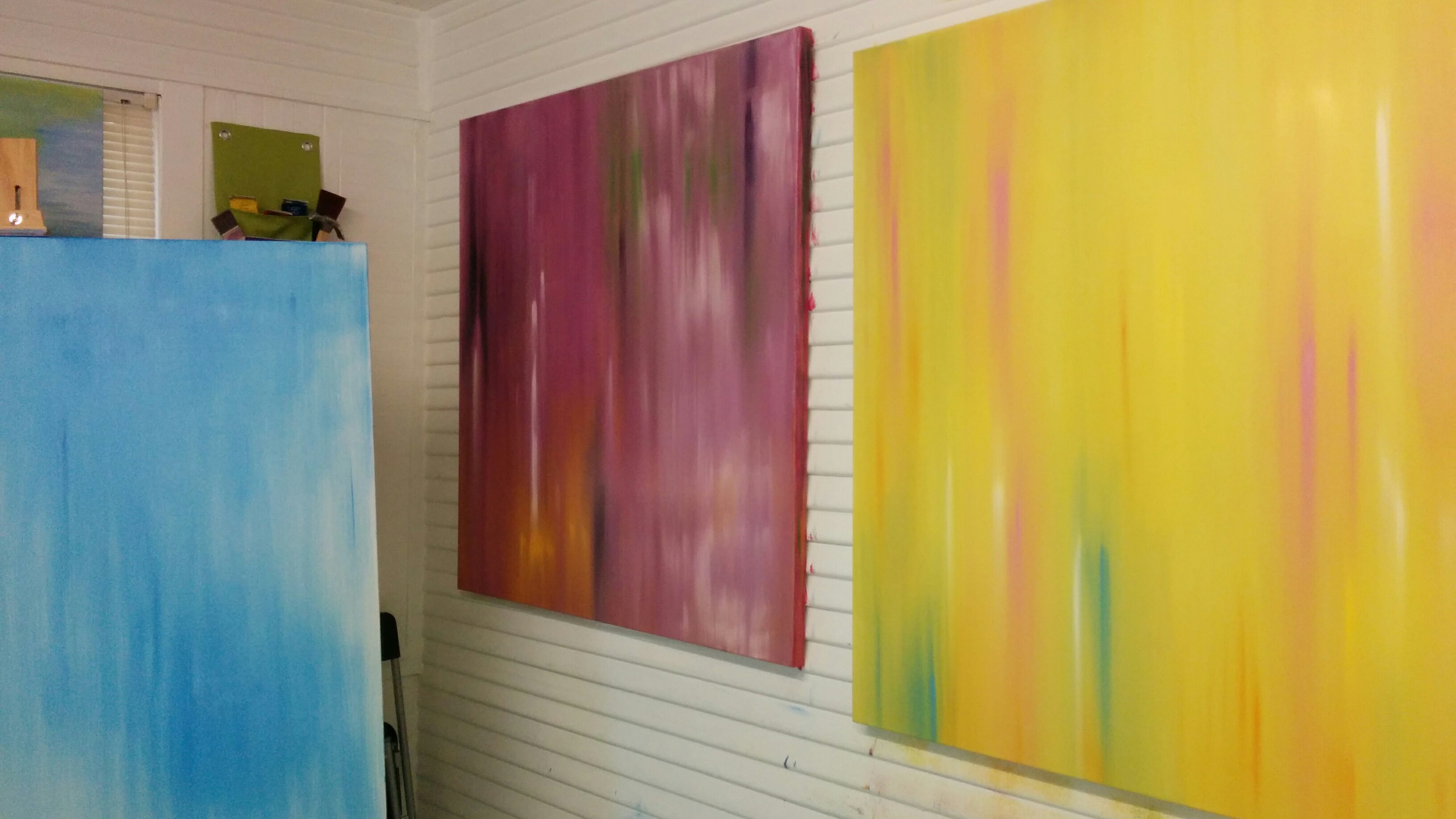 Brushwork continues on 48×48 canvases. The simple change of color invokes an emotional response that is powerful.